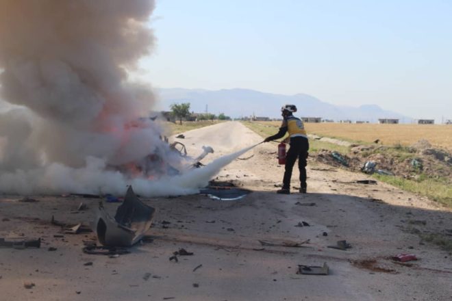 وأضاف الدفاع المدني أن هناك جثث عالقة في إحدى السياريتين وهي متفحمة لم يعرف عددهم تماما بسبب النيران المشتعلة في السيارة، ولم يتمكن فريق الإنقاذ من سحبهم مباشرة بسبب استهداف الفريق من قبل حواجز نظام الأسد القريبة من المنطقة.