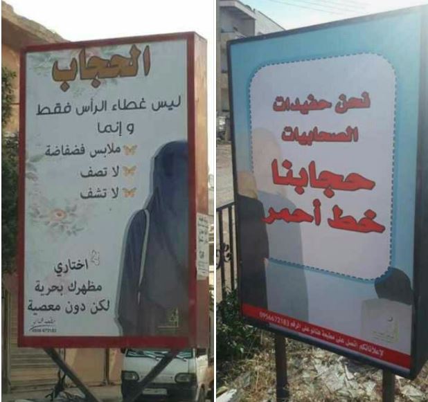 وانتشرت على مواقع التواصل الاجتماعي صور لافتات عليها عبارات تدعو للحجاب مثل “نحن حفيدات الصحابيات”، “عن الحجاب: ابنتي ما زالت صغيرة، عبارة قتلت في بناتنا روح العفة وحب الحياء”.