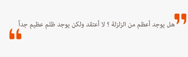 ” توجهت إلى الكراج لأذهب إلى أقرب منطقة آمنة كون الهزات الترددية لا تتوقف ولا يوجد سواي في المنزل فقررت أن أخرج لكي أرتاح من التفكير والخوف من الهزات، كنت أشاهد الحملات العنصرية التي تستهدف السوريين دون توقف فمرة تتهمهم بالسطو ومرة اخرى تتهمهم بأخذ أماكن الأتراك وخيمهم. المفاجأة، ولكنني تفاجأت بأن ما يحدث في وسائل التواصل وهو ما يحدث كثيرا_ يحدث في أرض الواقع فقد وجدت أنه لا يوجد سفر للسوريين وأنا هنا أقول لا يوجد سفر للسوريين وليس لا يوجد أماكن فالأماكن متاحة، ولكن الأولوية للأتراك وكأننا لم نتضرر مثلهم وكأننا لسنا بشر مثلهم. هل يوجد أعظم من الزلزلة؟ لا أعتقد، ولكن يوجد ظلم عظيم جداً”