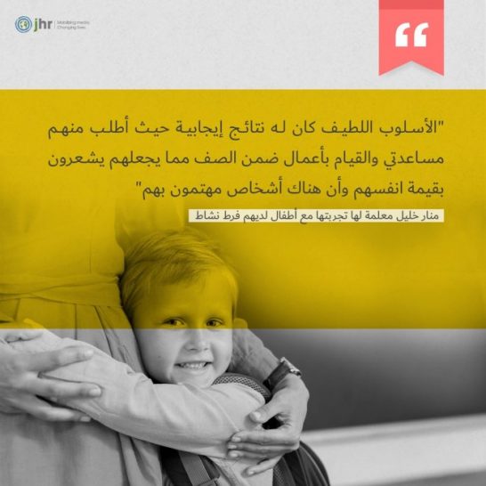 أكدت منار خليل وهي معلمة على دور الاهل في المنزل من خلال تجربتها مع أطفال لديهم فرط نشاط تقول “الأسلوب اللطيف كان له نتائج إيجابية حيث أطلب منهم مساعدتي والقيام بأعمال ضمن الصف مما يجعلهم يشعرون بقيمة أنفسهم وأن هناك أشخاص مهتمون بهم”