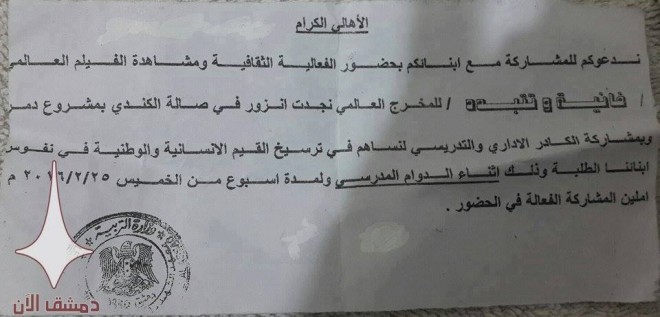 ونشرت بعض صفحات النظام صورًا للدعوات التي وجهتها “وزارة التربية” التابعة للنظام للأطفال (دون العاشرة بحسب صفحة دمشق الآن) لحضور الفيلم، والذي سمّته بالـ “فعالية ثقافية”، بالرغم مما يحتويه الفيلم من مشاهد لا تناسب الأطفال دون سن 18.