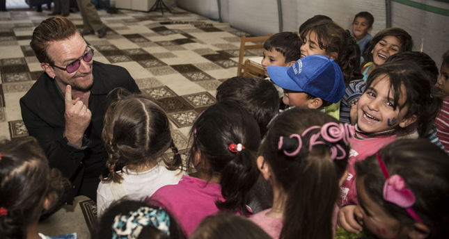 رافق المغني في فرقة “U2” بونو وفدًا من أعضاء مجلس الشيوخ والكونغرس الأمريكي في زيارة إلى مخيم للاجئين السوريين يضم 15 ألف لاجئ في بلدة نيزّب بولاية غازي عنتاب جنوب شرقي تركيا.