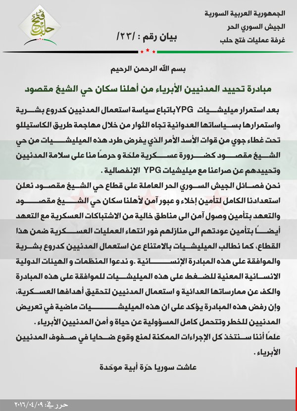 نشرت غرفة عمليات فتح حلب “مبادرة لتحييد المدنيين من سكان حي الشيخ مقصود” في بيان باسم الغرفة التابعة للجيش الحر، موجهة دعوتها لميليشيا YPG لتحييد المدنيين الذين تستخدمهم الأخيرة كدروع بشرية، وقد تعهدت الفصائل العاملة في حي الشيخ مقصود بتأمين إخلاء وعبور آمن لأهل حي الشيخ مقصود إلى مناطق خالية من الأشتباكات العسكرية مع التعهد بتأمين عودتهم إلى منازلهم فور انتهاء العمليات العسكرية.