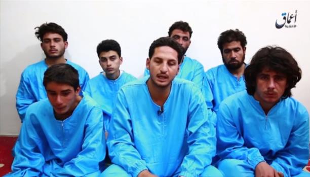 وعلى غير العادة، فقد ألبس التنظيم العناصر السبعة الذين يحضّر فيما يبدو لإعدامهم، لباساً أزرق، حيث ظهر جميع أسراه في التسجيلات السابقة، باللون البرتقالي الذي صار رمزاً لإجرامه.