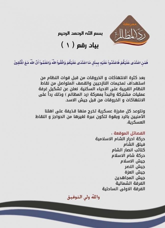 أعلنت صباح اليوم، عدة فصائل وكتائب عاملة في ريف اللاذقية عن تشكيل غرفة عمليات مشتركة للبدء بمعركة “رد المظالم” التي تأتي بعد كثرة الانتهاكات والخروقات من قبل قوات نظام الأسد بقصفها لمخيمات النازحين والأحياء السكنية، حسب البيان الذي تم إعلانه، كما توعّدت غرفة العمليات المشتركة كل مفرزة عسكرية تخرج منها قذيفة بالرد العنيف.