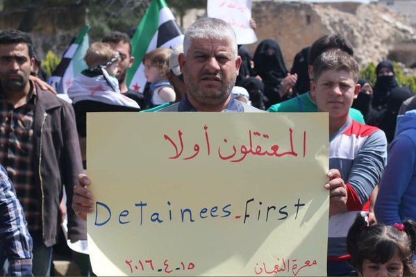 وكتب ناشطون في حملة صوت المعتقلين “المعتقلون أولاً لأنهم أكبر من أن يكونوا بنداً للتفاوض، إنهم شرط لوجود الحل، لأننا نرفض أن تكون حريتهم موضع مساومة مع جلادهم أياً كان، لأنهم يستحقون الحياة، لأنهم رهائن لدى سجانهم الأسد، ينتزعهم من حيواتهم، يحتجزهم بعيداً عن أهلهم، يعذبهم، يساوم على حريتهم، يجوعهم، يعطشهم، يقتلهم، يستخدمهم، يستغلهم… والعالم بمنظماته وحكوماته يكتفون بالفرجة”.