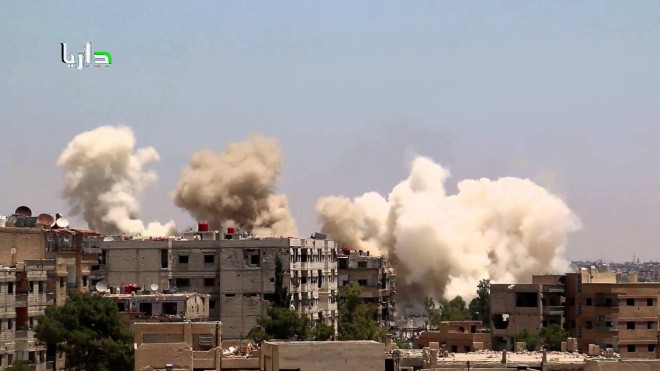 استشهد مدنيان اثنان وأصيب خمسة آخرون اليوم الخميس في قصف عنيف شنته قوات الأسد والميليشيات المساندة لها على مدينة داريا غرب دمشق.
