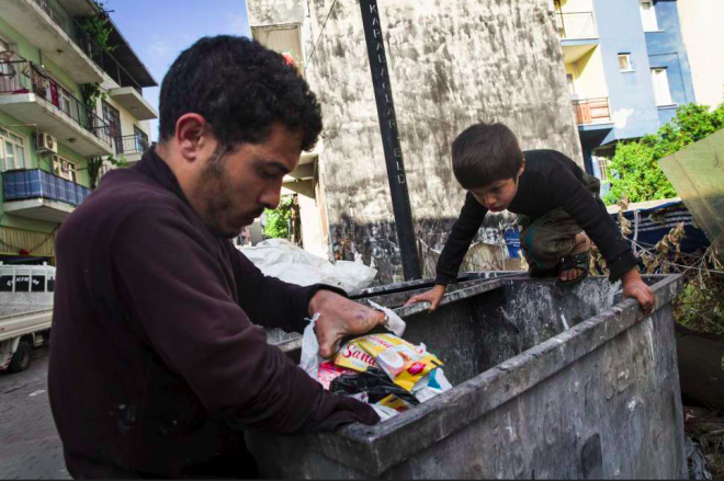 مع طلوع فجر كل يوم، يخرج فراس (٢٥عاماً) وطفله عدي (٧ سنوات) إلى شوارع مدينة إزمير في تركيا، ليصطادا ما يمكن بيعه من البلاستيك والكرتون والزجاج من حاويات القمامة في المدينة.