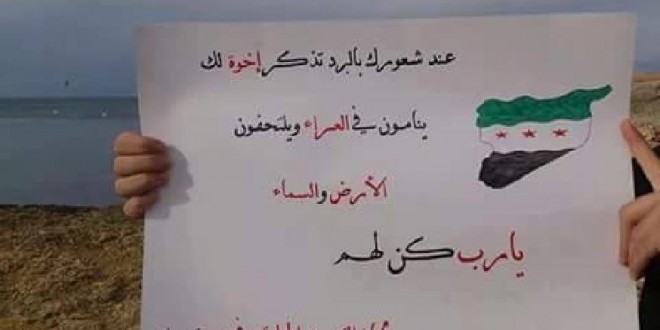 عبارات بحسب ما توحي له كل فترة، كما صورت اللافتات بمعظمهاعلى شاطئ البحر المتوسط، وكان أبرزها “وما أن يصرخصوت حر حتىيكمم .. الحرية لزيتونة الثورةرزان زيتونة “، ” ناطرينطلتك يا طل… طل الملوحي أيقونة الثورة” .