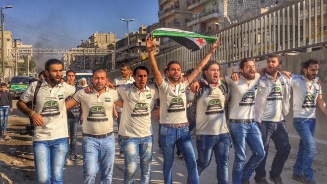 وجدد المتظاهرون دعمهم للفصائل المقاتلة، معبرين عن رفضهم الخروج من المدينة رغم المعارك والقصف الذي تتعرض له من قبل قوات النظام.