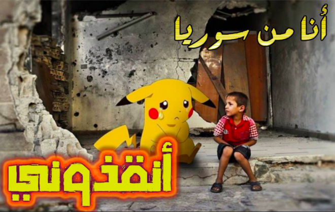 ونشر الناشطون صوراً لأطفال سوريين يحملون لافتات رسمت عليها البوكيمونات المفضلة لرواد هذه اللعبة وهي تطلب منهم القدوم إلى سورية وإنقاذ أطفالها، ورفع طفل رسماً لشخصية “بيكاتشو” في “بوكيمون”، وعليها عبارة تقول إنه محاصر في دوما بالغوطة الشرقية المحاصرة من القوات الحكومية ويطلب المساعدة. ورفع طفل آخر لافتة مشابهة في كفرنبل السورية.