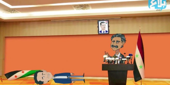 أنيميشن قصيراً يحاكي وقائع المؤتمر الصحفي لرئيس الائتلاف، خالد خوجة، مع