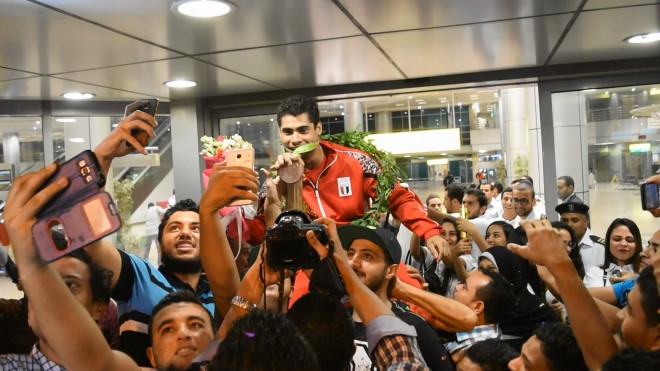 ورددت الجماهير الأردنية هتافات ترحب بـ”الفتى الذهبي” أبو غوش وحملوه على الأكتاف مع مدربه فارس العساف، وباقي أعضاء الوفد الأردني إلى الألعاب الأولمبية في ريو.