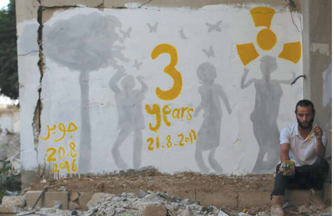 “لا أريد أن أعرض لوحاتي في المعارض، أريد أن أكون فنان شوارع” جملة بدأ بها رسام الغرافيتي أبو صلاح المعروف بـ”جعفر”، وقال “قمت أنا وفريق من الشبان بهذا النوع من الفن منذ أشهر، ورسمنا لوحات عدة من أهمها لوحة عن ذكرى الكيماوي، وأخرى عن التغيير الديموغرافي لداريا، وكانت إحدى لوحاتنا عن القصف الروسي، وهناك أفكار أخرى جديدة نجهز لها”.