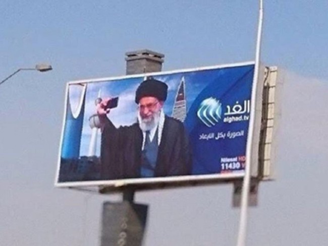 قناة “الغد” التي يملكها القيادي الفلسطيني الفتحاوي محمد دحلان، تضع في أحد شوارع العاصمة المصرية القاهرة إعلاناً ترويجياً لبرامجها… الإعلان عبارة عن صورة للمرشد الإيراني علي خامنئي وهو يلتقط صورة “سيلفي” وتظهر خلفه المعالم البارزة في دول الخليج العربي، مثل أبراج الكويت، وأبراج دبي وأبو ظبي، وبرج الرياض الشهير… وتتضمن رسالة واضحة في أن خامنئي سوف يصل إلى تلك الدول ويحتلها…