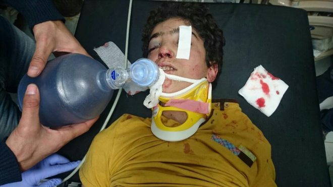 ” الطفل محمد المالح ابن العشر سنوات تعرض لرض نتيجة سقوطه من الطابق الرابع لتفادي القناص , يعاني من كسر في قاعدة الجمجمة , لوحظ نزف في الاذن اليسرى و علامة الراكون , الطفل بحاجة لعمل جراحي فوري للدماغ و هذا الامر غير متوفر في بلدة مضايا ”