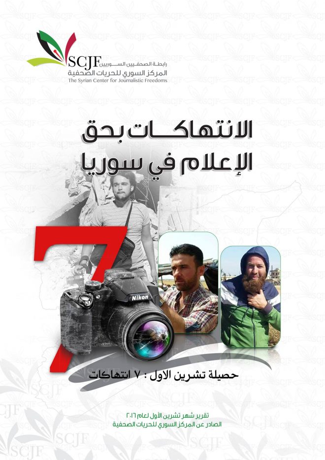 وثق المركز السوري للحريات الصحفية في رابطة الصحفيين السوريين، والمعني برصد وتوثيق الانتهاكات بحق الصحفيين والمواطنين الصحفيين والمراكز الإعلامية في سوريا وقوع 7 انتهاكات خلال شهر تشرين1 2016، وهو أقل عدد من الانتهاكات التي يوثقها المركز خلال هذا العام، وخاصة خلال الأشهر الأخيرة التي كانت قد شهدت إرتفاعاً ملحوظاً في عدد الانتهاكات، خاصة في محافظة حلب التي تركزت العمليات العسكرية فيها، وذلك عبر قصف الطيران الروسي والسوري على أحياء المدينة الشرقية في محاولة لإقتحامها، وهو ما أدى إلى وقوع خسائر بشرية ومادية كبيرة فيها. ولعل الهدن المتقطعة التي أُعلنت من جانب روسيا مؤخراً، ورغم عدم الإلتزام التام بها أدت إلى إنخفاض الخسائر في صفوف الإعلاميين نسبياً.