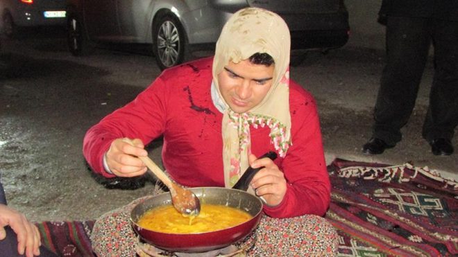 التقطت عدسة “الأناضول” صور أصدقاء سيفري قايا وهم يلبسونه ملابس نسائية، وينظمون له الاختبارات (المكائد) الواجب عليه اجتيازها كي يظفر بعروسته.