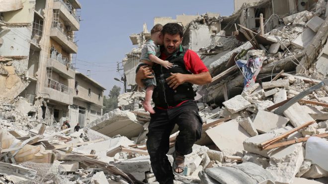 وقد وزّعت روسيا وقوات النظام السوري الأدوار بينهما، في إطار الحرب الدامية على المدينة. وفيما تولى النظام دك الأحياء الشرقية المحاصرة من المدينة بالطائرات والمدفعية والصواريخ، ركزت الطائرات الحربية الروسية غاراتها على ريف حلب ومحافظة إدلب، وسط تأكيد مصادر النظام بأن هذا القصف المكثف هو مقدمة لاقتحام المدينة بذريعة “إنقاذ الأهالي” من سيطرة المسلحين الذين يرغمونهم على البقاء في المدينة.