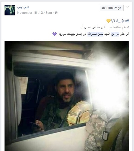 “أبو علي مرافق السيد حسن نصرالله في إحدى جبهات سوريا”. في منشور يعود إلى 16 من الجاري. وبالتاريخ ذاته، قام حساب فيسبوكي آخر باسم “فارس الدقس” بنشر صورة بالزي العسكري للمرافق المذكور، وإلى جانبه أحد العناصر. وكتب على الصورة إنها التقطت لمرافق نصرالله في سوريا.
