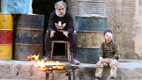 طفل مصاب يجلس بجوار رجل حول نار للتدفئة في منطقة تسيطر عليها المعارضة في حلب بشمال سوريا يوم الجمعة. تصوير عبد الرحمن إسماعيل - رويترز.