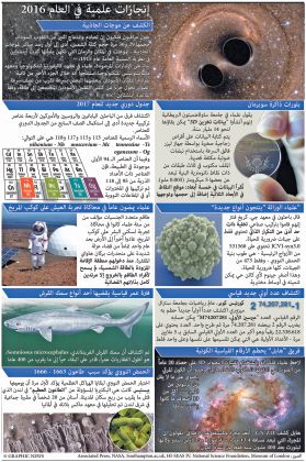 حفل العام 2016 بإنجازات علميّة، بل إنّها ربما يحتاج الكلام عنها كتاباً وليس مجرد مقال. من المستطاع إيراد بعض الشذرات والنتف من ذلك المسار، ما يمكن وصفه أيضاً بأنه «لملمات». ويسود شبه إجماع على كون اكتشاف موجات الجاذبيّة هو الإنجاز العلمي الأبرز للسنة المنصرّمة. وللمرّة الأولى، تمكن علماء الفضاء في وكالة «ناسا» من رصد تلك الموجات فعليّاً. وشكّل الأمر إثباتاً مدهشاً لصحة نظرية العالِم آلبرت آينشتاين في النسبيّة التي تنظر إلى الكون كأنه يشبه ملاءة ضخمة مفرودة، تنتثر عليها المجرات بنجومها وكواكبها. وتسري موجات الجاذبيّة في ذلك النسيج فتعطيه تماسكه وقوامه، كما أنها «تتفاعل» مع المجرات والنجوم والكواكب، بل كل المقوّمات المادية الملموسة للكون.