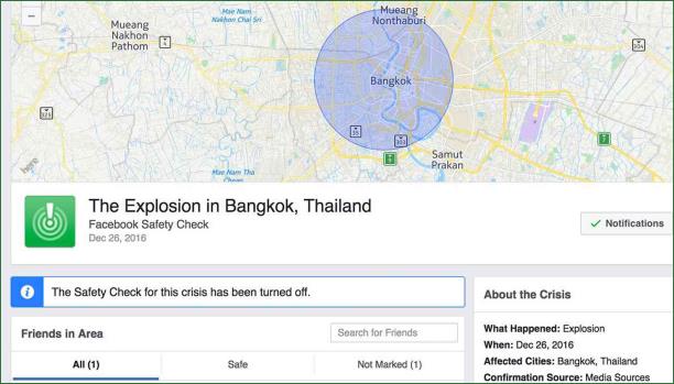 وظهر لمستخدمي الشبكة في تايلاند تنبيه للإشارة حول سلامتهم، يوم الثلاثاء، مع إيراد بعض التفاصيل حول متى وأين حدث الانفجار في بانكوك، فيما اعتُبر أنّه خداع تعرّضت له خوارزميات الموقع.