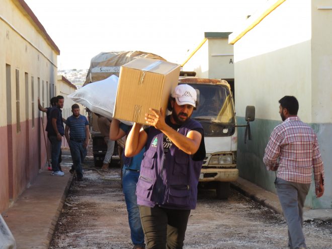 في البناء الذي يعرف بصالة الإغاثة جاء عشرات الأشخاص لتسجيل أسمائهم وذلك ضمن خطة العمل التي يشرف عليها ” فريق نور المدينة التطوعي”، ومع توافد الأهالي إلى الصالة انهمك أعضاء الفريق بأخذ البيانات العائلية منهم بينما جلس عدد من أهالي داريا بانتظار دورهم على مقاعد قبالة مكتب ” كامل قدحنون ” مدير الصالة والعضو في الفريق.