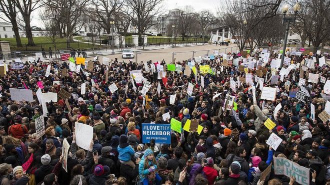 تجمع آلاف الأمريكيين، الأحد، أمام البيت الأبيض بالعاصمة واشنطن، احتجاجاً على قرار الرئيس دونالد ترامب، الذي يمنع مؤقتأ دخول اللاجئين ويحظر دخول مواطني 7 دول إلى الولايات المتحدة.