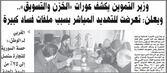 وقال وزير التجارة الداخلية، في حكومة الأسد، عبدالله الغربي، إنه تلقى تهديداً مباشراً “بسبب ملفات فساد كبيرة” من دون أن يخوض في تفاصيل هذا التهديد، حيث لم يسمّ الجهات التي هدّدته بالاسم، بل اكتفى بالإعلان عن التهديد فقط.