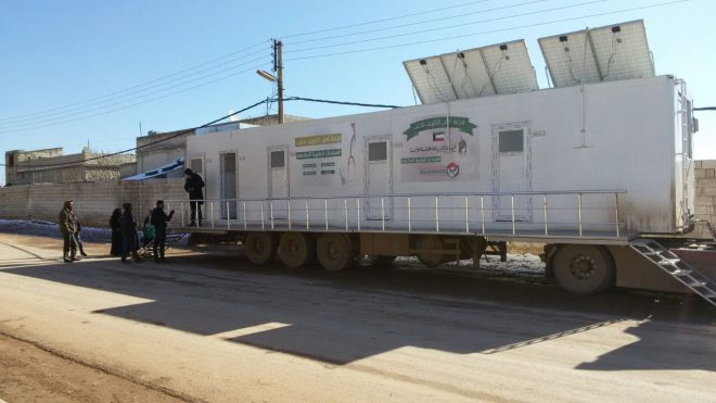 ومن بين هذه النماذج هناك عيادات متنقلة افتتحتها هيئة “ساعد” بتاريخ 21 كانون الأول 2017 بدعم من الهيئة الاسلامية العالمية، وتتألف من ثلاثة عيادات (داخلية، أطفال، نسائية) بالإضافة إلى صيدلية، ويشرف على كل منها طبيب مختص إلى جانب قابلة قانونية.
