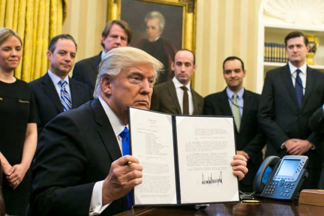 وحظر المرسوم الذي وقعه ترامب في 27 كانون الثاني/يناير دخول مواطني ايران والعراق وسوريا واليمن وليبيا والسودان والصومال الى الولايات المتحدة لمدة ثلاثة أشهر مع تعليق الهجرة لمدة اربعة اشهر للاجئين من هذه البلدان ولأجل غير مسمى بالنسبة للسوريين.
