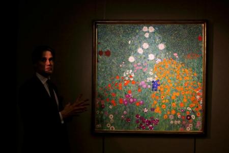 أحد خبرا دار سوذبيز للمزادات يقدم لوحة باورنجارتن للفنان النمساوي جوستاف كليمت خلال عرض في هونج كونج يوم 14 فبراير شباط 2017. تصوير: بوبي يب - رويترز. تستخدم الصورة للأغراض التحريرية فقط وتحظر إعادة بيعها أو الاحتفاظ بها في أرشيفات.