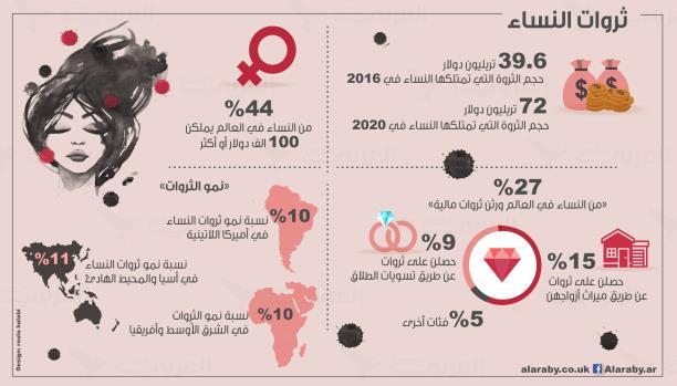 وتشير البيانات الصادرة عن تقرير الثروة العالمية، والذي خص النساء في أحد تقاريره إلى أن 44% من النساء اللاتي يملكن أموالاً تساوي 100 ألف دولار أو ما يزيد، وهن رائدات أعمال أو موظفات في شركات، واستطعن تنمية ثرواتهن باستقلالية ومن دون اعتماد على أي جهة.