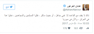 وتابع في تغريدة منفصلة: “تالله لا يقف مع القاعدة إلا غبي جاهل، أو خبيث ماكر، قتلوا المسلمين والمجاهدين، فعلوا هذا في العراق، والآن في سوريا.”