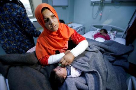 امرأة تجلس مع طفلتها في مستشفى حيث تعالج من تعرض محتمل لهجوم بسلاح كيماوي في صورة بتاريخ الرابع من مارس اذار 2017. تصوير: ازاد لاشكاري - رويترز.