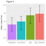 يشير معدا التقرير – الدكتور بير سيتلز والدكتور هاجلوارا وكلاهما عالم بحوث ومهندس برمجيات على منصة Duolingo – إلى أنهما حددا أيضًا مجموعات أنماط الاستخدام، مثل الـweekenders وهم الأشخاص الذين يستخدمون التطبيق في العطلات الأسبوعية فقط، أو nine-to-fivers وهم الأشخاص الذين يدرسون خلال ساعات العمل العادية. ويظهر الشكل رقم 3 أن مجموعات الاستخدام هذه تظهر قدرة تعلم أقل عن المجموعة التي تستخدم التطبيق بشكل يومي، بل قد ظهر أن الأشخاص الذين يدرسون قبل النوم بشكل يومي يحققون نتائج أفضل قليلًا. وهذا يتسق مع البحث الذي أكد فعالية تعلم اللغة أثناء النوم.