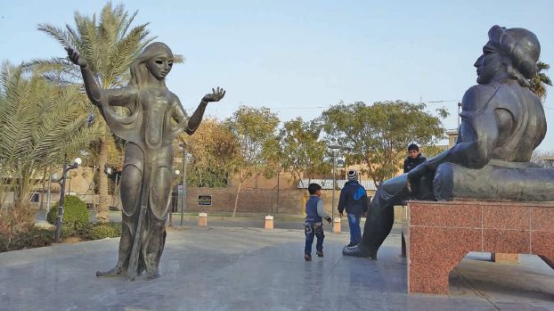 ترتفع شهرزاد بطول أربعة أمتار وتشير بيديها في شكل يثير الانتباه وكأنها لا تتوقف عن الرواية، فيما يتمدد شهريار فوق مدرجات من الحجر ترتفـــع متــرين ويبــدو منصتاً لحكاياتها المتواصلة منتبهاً في شكل كامل لما تقول غير آبه بما يدور حوله وغير مكترث بزواره الذي يلتقطون بجانبه الصــور التذكارية، فكل ما يريـــده هو الوصــول إلى نهاية الحكاية، يده التي تم قطعها في وقت سابق من متشددين تم تعويضها بأخرى تحاول أن تكون جزءاً من الجسد الممدد.