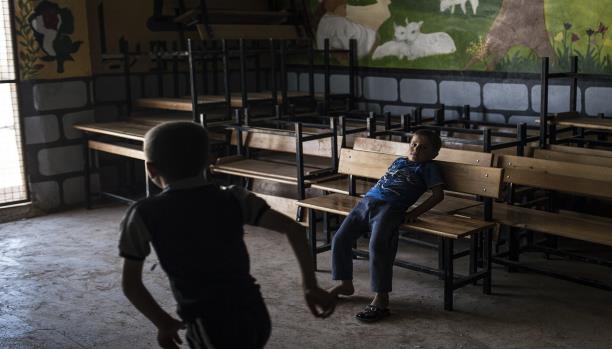 وليس بعيداً عنهم، يتجمّع أطفال تراوح أعمارهم ما بين العاشرة والثانية عشرة، ما زالوا يرتدون الزي المدرسي، حول شاحنة محلية الصنع وصغيرة الحجم. أحدُهم يعتلي الشاحنة ويبدو أنه الأقوى جسدياً بينهم، يحمل عصاً بين يديه. يقول إن الدوشكا (رشاش من العيار الثقيل) جاهز، فيتوزّع البقية في الشارع، قبل مهاجمة طفل يمر بمحاذاتهم وإجباره على السير معهم إلى الشاحنة، قائلين “أمسكنا إرهابياً”. بعدها، ينزل الطفل الموجود فوق الشاحنة، ويستخدم العصا التي معه ويمرّرها على عنقه محاكياً مشاهد “الذبح”. ثمّ يضحكون ويطلقون سراحه وينتظرون مرور آخر.