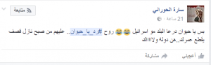 وانتشر الهاشتاغ بشكل سريع على مواقع التواصل، حيث كتبت سارة الحوراني على موقع “فيس بوك”: “بس يا حيوان درعا البلد مو إسرائيل… روح رد يا حيوان.. عليهم من صبح نازل قصف يقطع عمرك..هن دولة ولاااااك”.