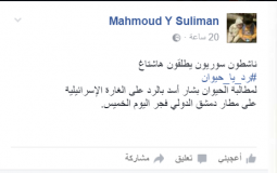 ونشر “محمود سليمان” :” ناشطون سوريون يطلقون هاشتاغ  رد يا حيوان  لمطالبة الحيوان بشار أسد بالرد على الغارة الإسرائيلة على مطار دمشق الدولي، فجر اليوم الخميس.”