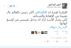 وعلى موقع تويتر غرّد “أيمن أبو أنس”: “افتكرنا لفترة أن القذافي أكثر رئيس بالعالم نال نصيبه من الإهانة والشتائم لكن بشار الأسد أراد ان يدخل غينيس من أوسع أبوابها رد يا حيوان”
