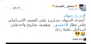وغرّد “شعيل العتيبي”: “رد يا حيوان  أتحدى الحيوان بشار يرد على القصف الإسرائيلي على مطار دمشق، ويقصف بصاروخ واحد على اسرائيل ،عليه ردي.”