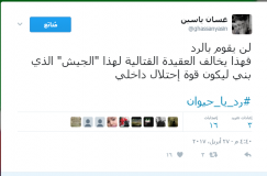 وغرد الصحفي السوري “غسان ياسين”: “لن يقوم بالرد فهذا يخالف العقيدة القتالية لهذا “الجيش” الذي بني ليكون قوة احتلال داخلي  رد يا حيوان”