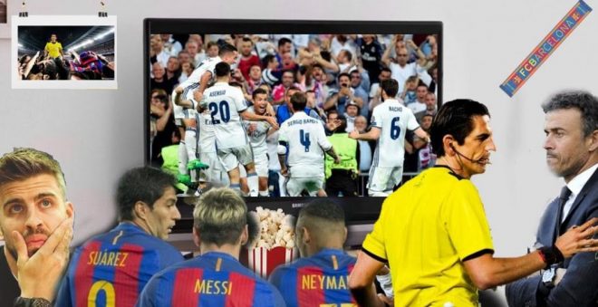 وضمت الصورة ثلاثي خط هجوم برشلونة الـ “MSN” وهم أمام التلفاز لمتابعة لقاء ريال مدريد واضعين أمامهم وعاء من البوشار، كما ظهر المدافع “جيرارد بيكيه” في وضع “حيرة”، مع لقطة أيضًا للمدرب “لويس إنريكي” مأخوذة من المباراة الأخيرة للفريق الكتالوني في دوري الأبطال.