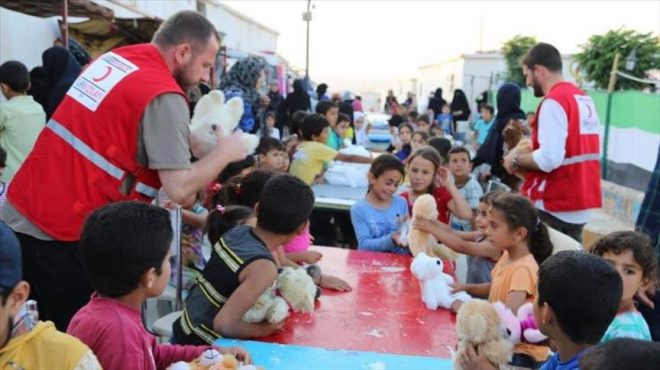 وأمضى مسؤولو الهلال الأحمر التركي بعض الوقت مع الأيتام السوريين، ورسموا البسمة في وجوههم بتقديم الهدايا والحلوى لهم.