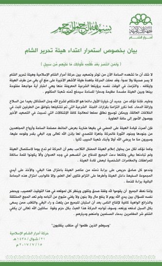 جاء ذلك في بيانٍ رسمي نشرته الحركة، قالت فيه:”إنه في حال استمرار بغي الهيئة ضاربةً عرض الحائط مصلحة الساحة وأرواح المجاهدين، فإن الحركة مستعدة لصد البغي”.