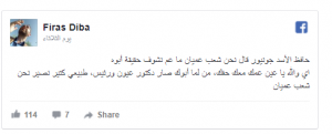 وعلق فراس “حافظ الأسد جونيور قال نحن شعب عميان ما عم نشوف حقيقة أبوه اي والله يا عين عمك معك حقك، من لما أبوك صار دكتور عيون ورئيس، طبيعي كتير نصير نحن شعب عميان”.