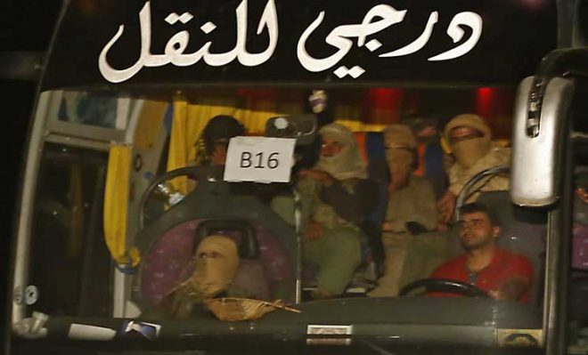 ويوجد نحو 300 مسلح من الدولة الإسلامية و300 مدني في القافلة التي منحها الجيش السوري وجماعة حزب الله اللبنانية ممرا آمنا بعد استسلام المتشددين في جيب على الحدود السورية اللبنانية.
