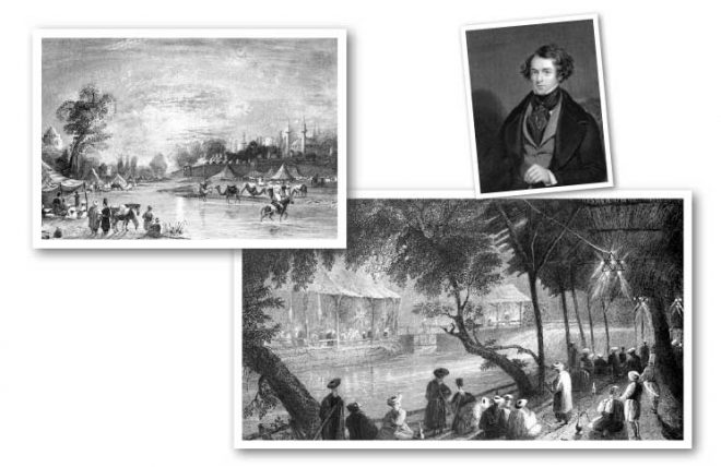 واللافت أيضاً في صورة بارتليت ـ كما بيّن المؤرخ والمعماري السوري سامر عكاش في كتابه «يوميات شامية»- هو غياب النساء عن مشهده الذكوري بالكامل، بعكس ما تصوره لنا رواية أحمد البديري الحلاق عن سيران دمشق قبل قرابة ثمانين عاماً من زيارته لدمشق؛ ولعل هذا الغياب يعكس دور المخيلة الاستشراقية التي أثّرت في رسم بارتليت لواقع المدينة الشرقية، وهي مخيّلة بقيت كما يبدو في هذه الصورة وفي رواية ثانية – يذكرها في سياق اكتشافه لمدينة دمشق و»لعوالمها المحجوبة» وتتعلق بطلب «ملا رفيع المستوى/فقيه» (لا يأتي على ذكر اسمه) منه مرافقته إلى مخدع زوجته لرسم صورة لها- لا ترى أي دور للنساء داخل الفضاء العام خارج غرف «الحريم السرية والغامضة» وفق تعبير الفنان، أو داخل بعض الحمامات؛ مع ضرورة الإشارة هنا إلى أن هذه المخيلة لم تكن مدعومة ـ بصور وشغف أيروتيكي- كان دارجاً في رحلات الأوروبيين إلى الدولة العثمانية في القرنين السادس عشر والسابع عشر. وربما لو غامر بارتليت بالذهاب إلى يوميات البديري المنشورة عام 1750 ـ كما يبيّن عكاش في كتابه السابق- لكان حظي بصورة مغايرة للنساء في دمشق العثمانية، وذلك قبل زيارته للمدينة بثمانين سنة. إذ يذكر الحلاق الشعبي تفاصيل سيران حضره مع جمع من الأصدقاء في ناحية تدعى الشرف، مطلة على نهر بردى (من الضفة نفسها التي رسم فيها صورته لنهر بردى) «وفي يوم الخميس، الثامن عشر من ربيع الثاني، خرجنا إلى سيران الشرف المطل على المرجة مع بعض أحبابنا. وكان الوقت في أول خروج الزهر في البساتين، وجلسنا مطلين على المرجة والتكية السليمانية. وجدنا النساء وربما كانوا في الكثرة أغلب من الرجال، جالسين على شفير النهر، وهم حول المرجة، والتكية طوال النهار بالمأكل والمشرب والتتن والقهوة، كما يفعل الرجال. وهذا شيء ما رأيناه، ولا الذي هم من قبلنا، إلا في هذا الزمن».